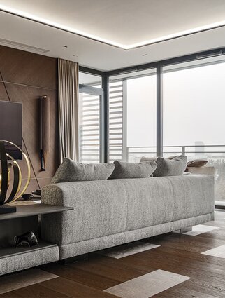 Ta warstwowa podłoga dębowa tłumi światło i subtelnie reaguje na jego zmiany w ciągu dnia, wprowadzając atmosferę spokoju i równowagi. Staje się materialnym wyrazem architektury, a nie jedynie jej tłem.